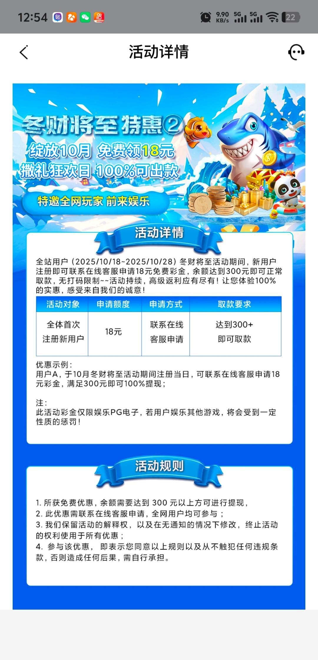 10月18号-10月28号活动期间内注册才送,没玩过这个平台的兄弟可以去注册联系客服申请,满300才能提现,仅限PG电子
